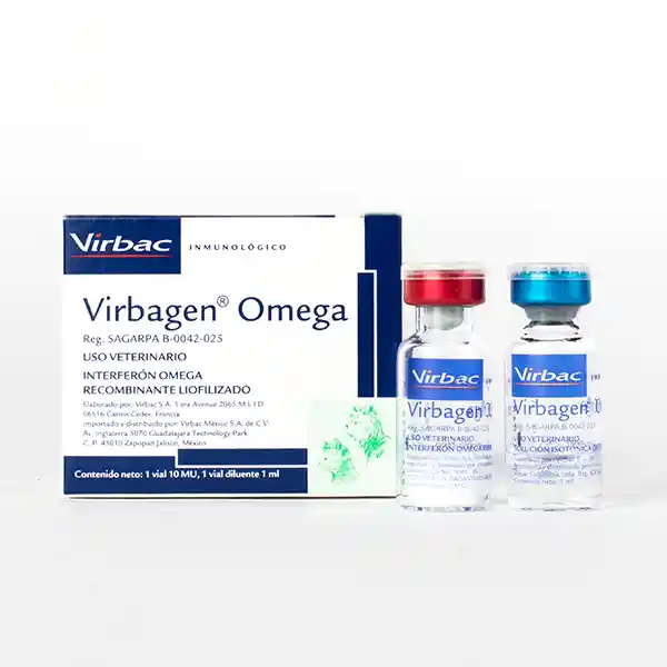 Virbagen® Omega, auxiliar en el tratamiento de enfermedades de Origen Viral en Gatos y perros. USO VETERINARIO Interferón omega recombinante liofilizado. PRESENTACIÓN: Frasco de 1 ml con 10 MU INDICACIONES: Coadyuvante en el tratamiento de la parvovirosis canina en perros; y en gatos contra la retrovirosis felina (FeLV, FIV). El uso de Virbagen®Omega ha demostrado disminución en la mortalidad, signos clínicos y lesiones ocasionadas por la infección del parvovirus canino. DOSIS: Perros: 2.5 MU/ kg peso durante 3 días consecutivos que equivale a 0.25 ml por cada kilo de peso. Se puede aplicar a partir del primer mes de edad. Gatos: 1 MU/kg de peso durante 5 días consecutivos VÍA DE ADMINISTRACIÓN: Perros : Vía intravenosa. Gatos: Vía subcutánea. Modo de uso: Reconstituya el liofilizado sólo con el diluente que lo acompaña. Utilice todo el contenido una vez reconstituido. ADVERTENCIAS: Manténgase en refrigeración entre 2 y 8 grados centígrados y en estricta protección de la luz solar directa. No permita el congelamiento. Manténgase fuera del alcance de los niños y animales domésticos. CONSULTE AL MÉDICO VETERINARIO FÓRMULA: Cada dosis contiene: Fracción liofilizada Interferón Omega recombinante de origen felino 10 MU Excipiente c.b.p. 1 dosis Fracción líquida Solución isotónica de cloruro de sodio 1 ml