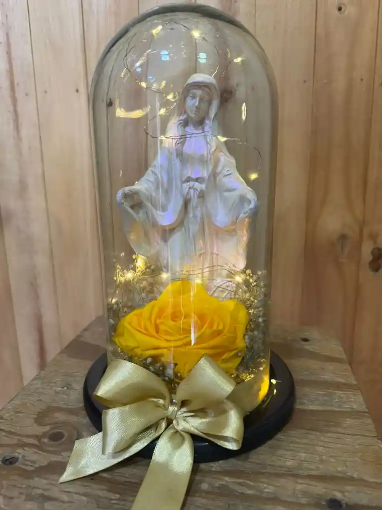 INCLUYE: Virgen con rosa preservada color amarilla, luz led y cúpula en vidrio y base de madera. Ideal para un lindo regalo o decorar tu espacio. Si quieres agregar un mensaje de regalo puedes dejarlo en nuestro chat.