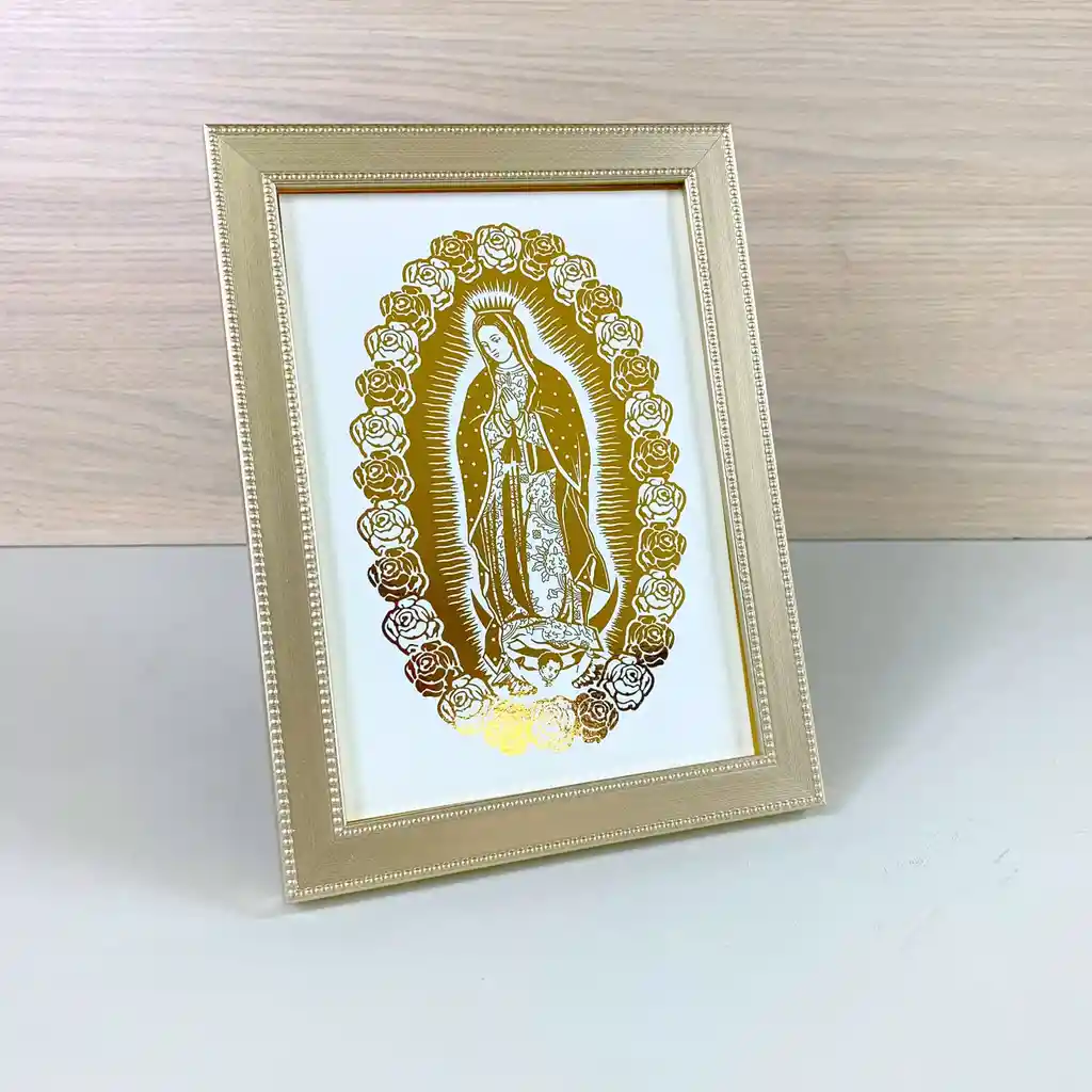 Portarretrato Virgen de Guadalupe Dimensión: 20 x 15 cm Color: Dorado Impresión: Estampado al calor