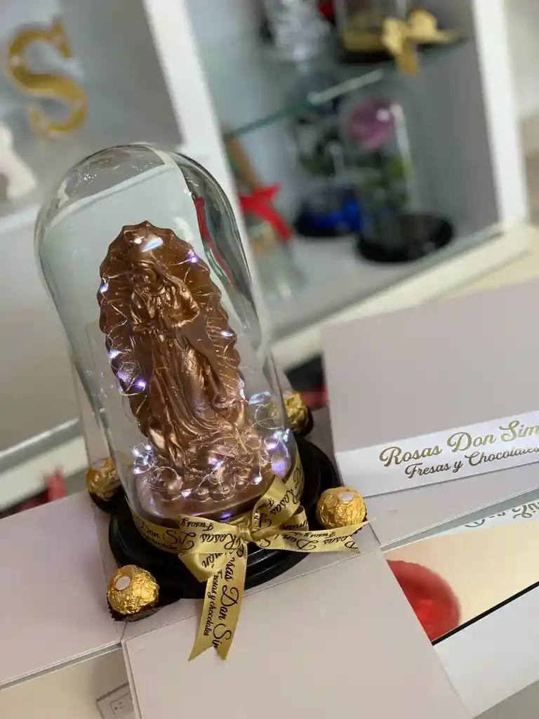 Virgen de Guadalupe en cerámica color según disponibilidad, caja sorpresa personalizada, 4 chocolates Ferrero, globos metalizados en helio y tarjeta mensaje.