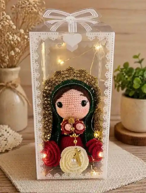 Sorprende a esa mujer que lo merece todo con un regalo lleno de fe y ternura. Hecho a mano: Virgen amigurumi Guadalupana tejida en material premium, bordada con flores y acabados dorados. Vitrina iluminada: Caja acrílica transparente con micro luces LED (pilas incluidas) lista para obsequiar. Accesorios incluidos: Mini rosario metálico dorado. Rosas tejidas en la parte inferior Medidas: 18 cm alto (aprox.) vitrina 23 cm × 10 cm. Empaque seguro y tarjeta de “Feliz Día de la Madre”. ¡¡¡TU PEDIDO INCLUYE TARJETA!!! INGRESA EL MENSAJE QUE DESEAS ENVIAR EN: "COMENTARIO AL SHOPPER"