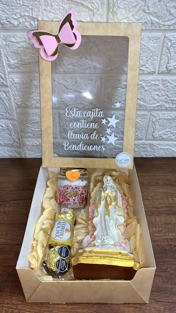 virgen Guadalupe imagen de fe con vela con aroma ,chocolates ferrero y un mensaje cargado de bendiciones