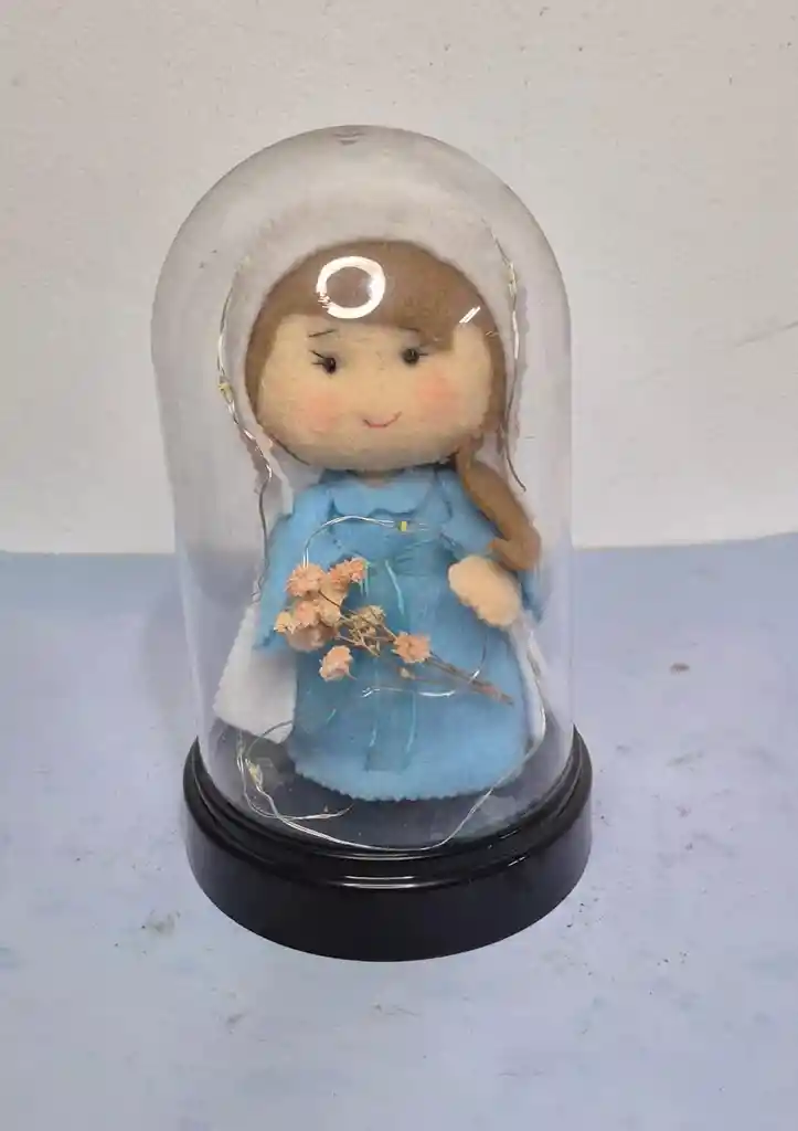 VIRGEN MARIA ELABORADA EN PAÑO LENCI EN CUMPULA Y LUZ INTERIOR DE 14CM
