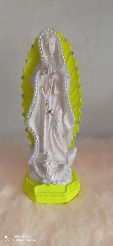 Virgen en cerámica, blanca y neón. 23 cm de altura. Incluye Denario.