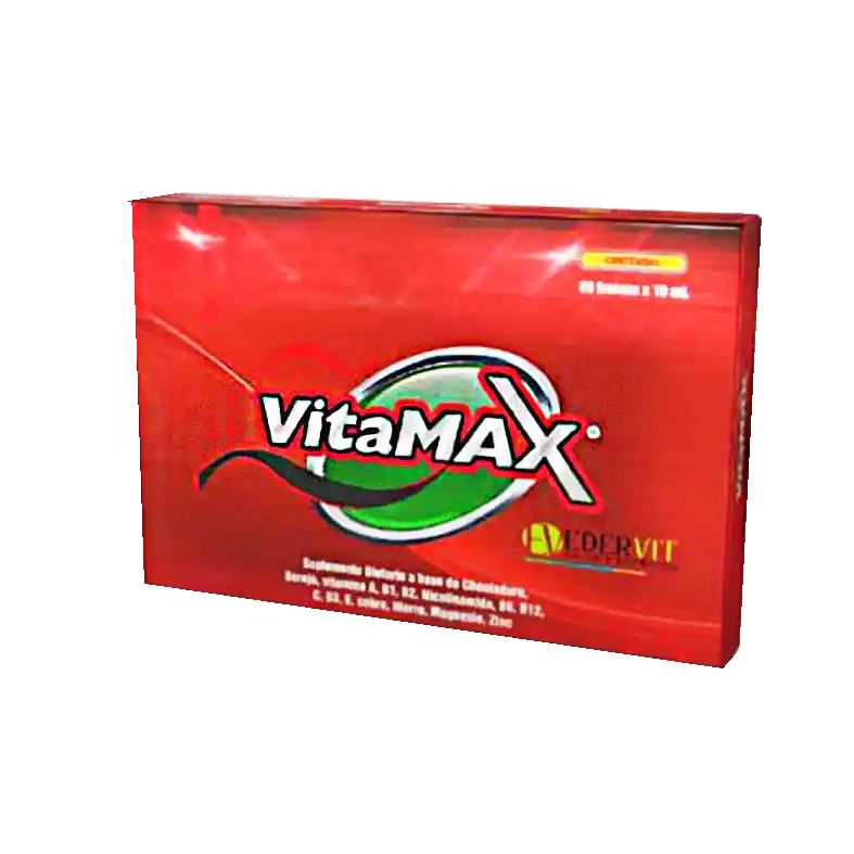 VitaMax Edervit Suplemento dietario a base de chontaduro, borojó, vitaminas A, B1, B2, B6, B12, C, D3, E, Nicotinamida, Cobre, Hierro, Magnesio y Zinc. Modo de uso. Adultos y niños mayores de 4 años. Tomar un vial con 1 comida principal. Presentación: 20 Frascos de 10 ml.