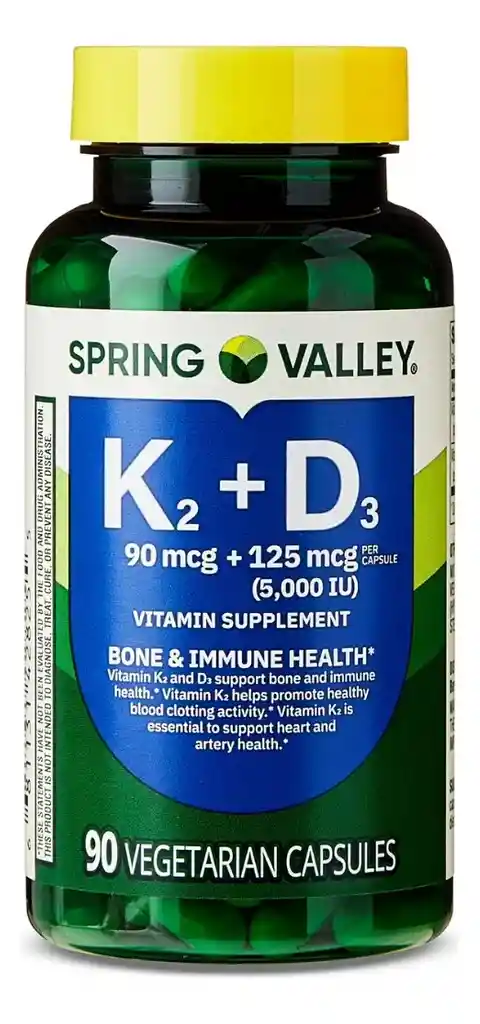 Detalles de producto Spring Valley Vitamin K2 + D3 90 cápsulas vegetarianas son vitaminas solubles en grasa y juegan un papel central en el metabolismo del calcio que es esencial para la salud ósea. Promueve la producción de proteínas dependientes de la vitamina K, que requieren vitamina K para la carboxilación para funcionar correctamente. También parece disminuir la incidencia de fracturas de cadera, vertebrales y no vertebrales en mujeres con osteoporosis posmenopáusica. Cada una de las 90 cápsulas vegetarianas está hecha con ingredientes que no tienen gluten, colorantes artificiales, jarabe de maíz con alto contenido de fructosa, saborizantes artificiales, conservantes, soya, maní y lácteos. Dé un paso hacia el logro de una mejor salud del tracto urinario con nuestras cápsulas de suplemento dietético vegetariano Spring Valley Vitamins K2 + D3 90. Spring Valley entiende que vivir un estilo de vida saludable y equilibrado es la clave para ser lo mejor posible. Con una gama asequible de productos inspirados en la naturaleza, Spring Valley apoya la salud y el bienestar holístico de usted y su familia. Cápsulas vegetarianas de vitamina K2 + D3 de Spring Valley, 5000 UI, 90 unidades: Esencial para la absorción adecuada de calcio y para apoyar la salud ósea e inmunológica.* Esencial para apoyar la salud y la salud de las arterias.* Ayuda al cuerpo a transportar calcio y apoya la salud de los huesos.* También ayuda a promover una actividad saludable de coagulación de la sangre.* Sin gluten, Sin colorantes artificiales, Sin jarabe de maíz de alta fructosa, Sin saborizantes artificiales, Sin conservantes, Sin soja, Sin maní, Sin lácteos 90 cápsulas vegetarianas por botella