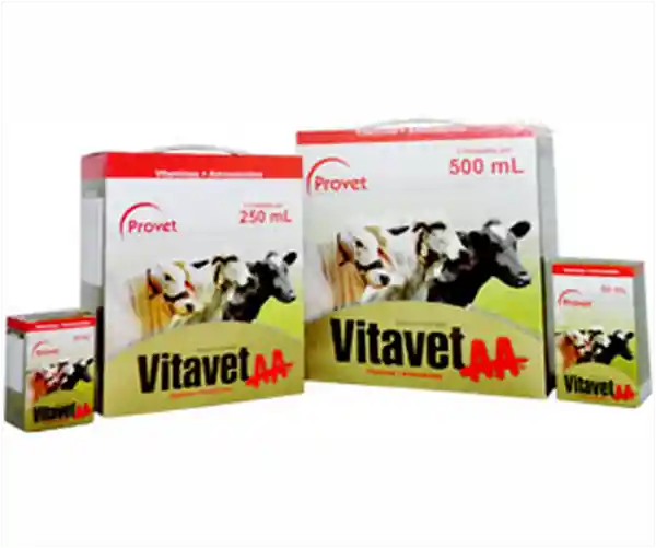 Vitavet Aa. Multivitamínico Con Aminoácidos.Especies: Bovinos, Caninos, Equinos, Ovinos, Porcinos.Presentación: 20 Ml | 50 Ml | 250 Ml | 500 Ml.