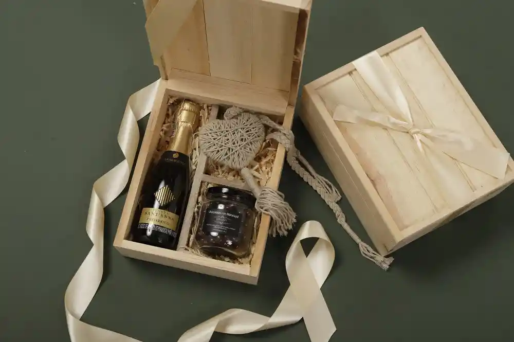 Botella pequeña de Proseco acompañada de chocolates amargos rellenos con fruta de la pasión (maracuyá) y corazón bordado para decoración