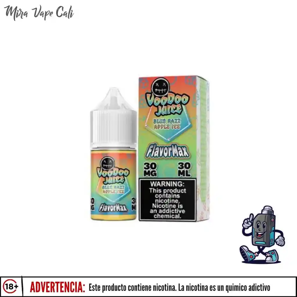 Arándano Frambuesa Azul Manzana con Hielo - La línea VooDoo Flavor Max está diseñada para brindarte un efecto "Desechable", súper dulce y sabroso con el golpe "desechable" adecuado. Tamaño de la botella: 30 ml Nivel de nicotina: 50 mg Proporción: VG/PG: 50VG/50PG Prohibida la venta a menores de edad. Producto nocivo para la salud que contiene nicotina, sustancia altamente adictiva. Antes de consumir consulte las indicaciones y contraindicaciones de uso