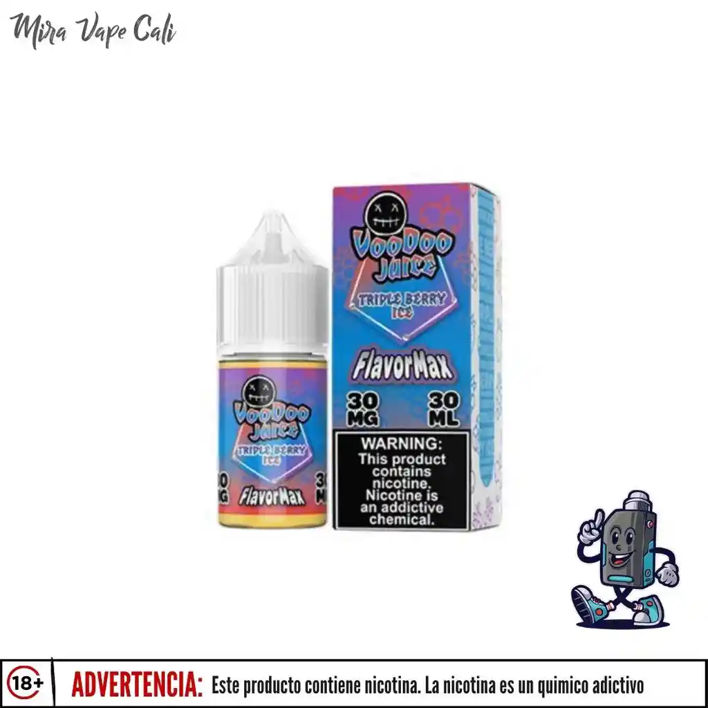 Mezcla de Bayas con Hielo - La línea VooDoo Flavor Max está diseñada para brindarte un efecto "Desechable", súper dulce y sabroso con el golpe "desechable" adecuado. Tamaño de la botella: 30 ml Nivel de nicotina: 50 mg Proporción: VG/PG: 50VG/50PG Prohibida la venta a menores de edad. Producto nocivo para la salud que contiene nicotina, sustancia altamente adictiva. Antes de consumir consulte las indicaciones y contraindicaciones de uso