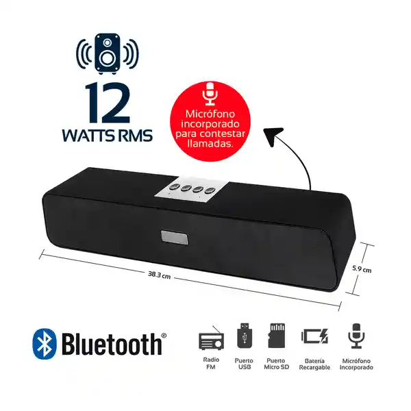 Características: Barra de Audio Recargable de Diseño y Estilo Practico y Elegante. Ideal Para Llevar Música a Todas Partes, Gracias a su Tamaño Ligero se Adecua Bien en Varios Ambientes. Potencia de 12W Rms Sonido Estéreo. Tecnología de Conexión Bluetooth V4.2. Micrófono Incorporado Para Contestar Llamadas Vía Bluetooth. Puerto de Lectura Usb y Micro Sd (32Gb Máx.). Entrada Auxiliar 3.5 mm. Radio Fm. Puerto de Carga Por Conector Micro Usb. Rango de Alcance Bluetooth 10 Metros. Micrófono Incorporado Para Función Manos Libres Por Bluetooth Especificaciones Técnicas: Potencia de 6W 2. 2 Parlantes de 2” Con Cono Central Pasivo. Batería Recargable 3.7 V 1200 Mah. Voltaje de Recarga 5V Dc 1A. Tiempo de Carga: 2 a 3 Horas. Tiempo de Autonomía: 3 a 4 Horas. Frecuencia de Respuesta: 100Hz-20Khz. Relación Señal / Ruido: >70 Db.