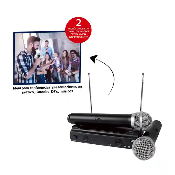 Kit Contiene: Vta Transmisor Con 2 Micrófonos Inalámbricos 1 Und + Vta Micrófonos Con Canal y Control de Volumen Independientes 1 Und. Ideal Para Conferencias, Hablar en Público, Karaoke, Dj´S, Músicos (2 Cantantes o Cantante e Instrumento). Base Receptora Con Doble Antena Para Mayor Cobertura. Alta Sensibilidad y Respuesta a Diferentes Rangos de Frecuencia. 1 Salida de Audio 6.3 mm Interruptor de Encendido. Fácil de Conectar, no Requiere Instalaciones Profesionales. Diseño Compacto y Portable. Color: Negro Uso Interior Especificación Técnica Voltaje de Operación del Receptor Inalámbrico: 12V Dc - 100Ma Cada Micrófono Utiliza 2 Baterías Aa Autonomía de Hasta 3 Horas en Uso Continuo. Respuesta de Frecuencia: 50Hz-18Khz. desviación Máxima: 15Khz Con Límite de Nivel. Estabilidad: 0.005% Rango Dinámico: 110Db. T.H.D: 0.5%. Rango de Operación: 20 – 40 Metros Aproximadamente Bajo Condiciones Óptimas.