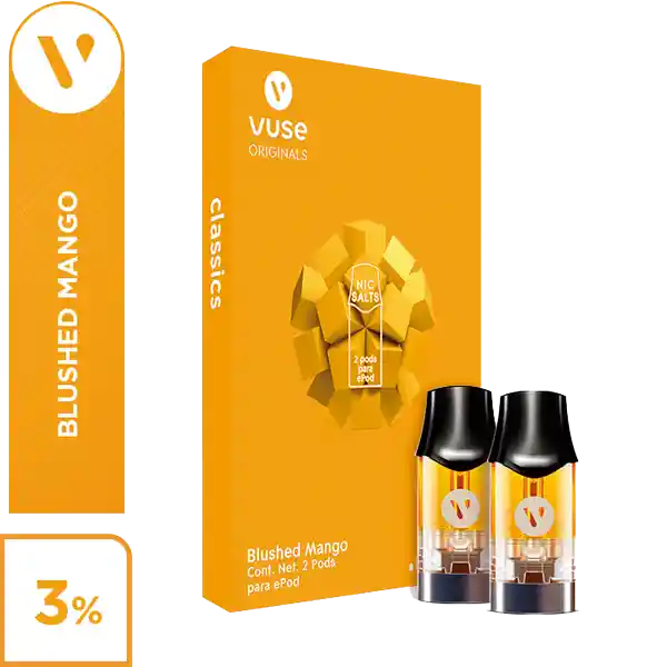 Contiene 2 pods sabor Blushed Mango 34 mg para ePod2 de 1.9 ml. de líquido vaporizable, cada uno. +18 Producto exclusivo para mayores de edad. Contiene nicotina, sustancia adictiva. Puede ser nocivo para la salud.