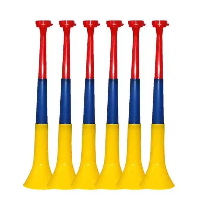 Una vuvuzela es un tipo de trompeta larga o corneta hecha de material plástico, utilizada por los aficionados para animar a sus equipos o clubes deportivos 6 Vuvuzelas tricolor Medidas extendida 56 cm