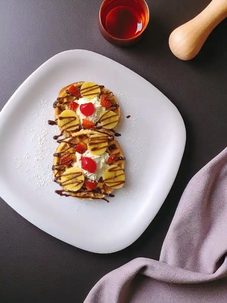 2 waffles con salsa de chocolate, crema chantilly, rodajas de banano, fresas frescas y una cereza.