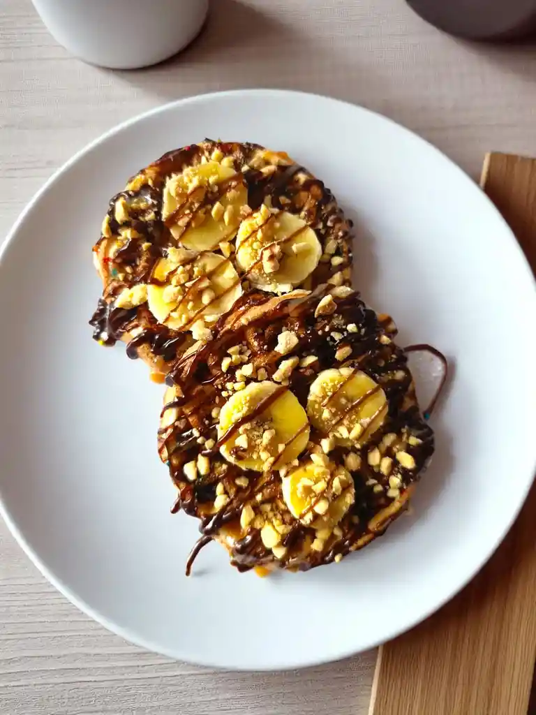 2 waffles con salsa de chocolate y arequipe, maní triturado y rodajas de banano.