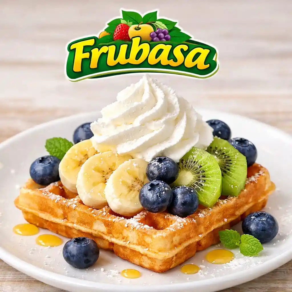 PORCION PERSONAL DE WAFFLE CON KIWI BANANO Y ARANNDANOS CON CREMA CHANTILLY O HELADO Y SALSAS DE CHOCOLATE FRESA O AREQUIPE O LECHE CONDENSADA