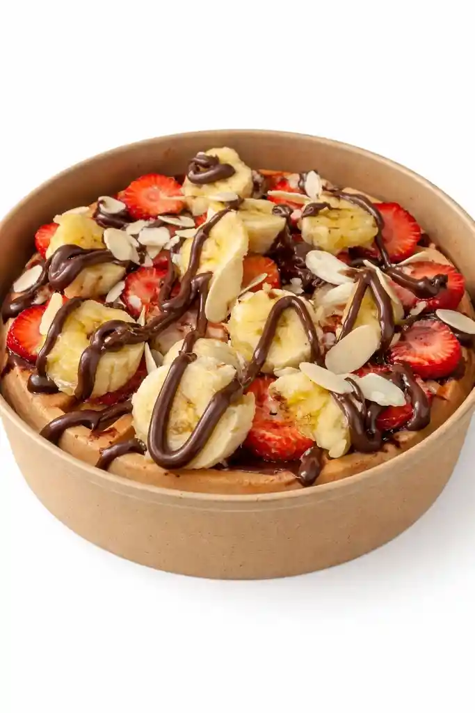 Waffle recién horneado, bañado en salsa de chocolate negro, jugosas fresas, queso y galleta oreo que le da un toque irresistible.