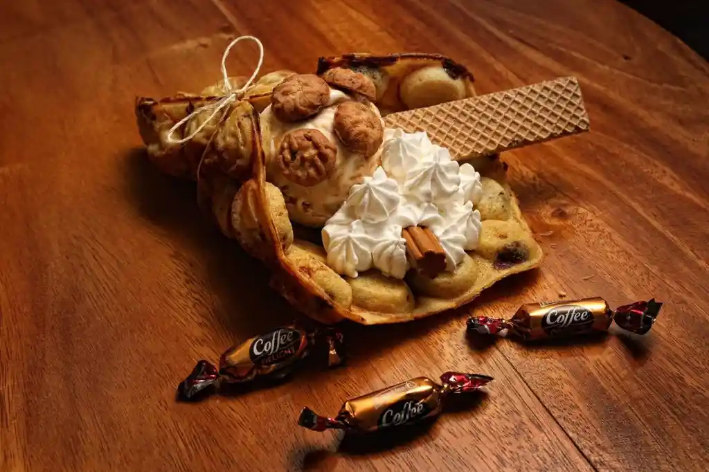 Delicioso Waffle con base de vainilla,relleno chip de chocolate,galleta mini chips,galleta de colcafe,galleta triturada,cocoa,crema de queso,helado de capuccino,salsa de caramelo