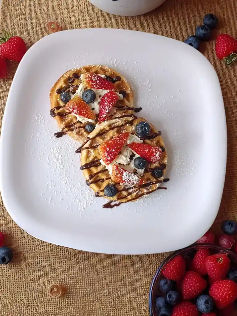 2 waffles con crema de chocolate, crema chantilly, fresas y arándanos.