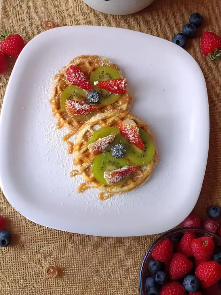 2 waffles con leche condensada y arequipe, acompañados de kiwi, fresa y arándano.