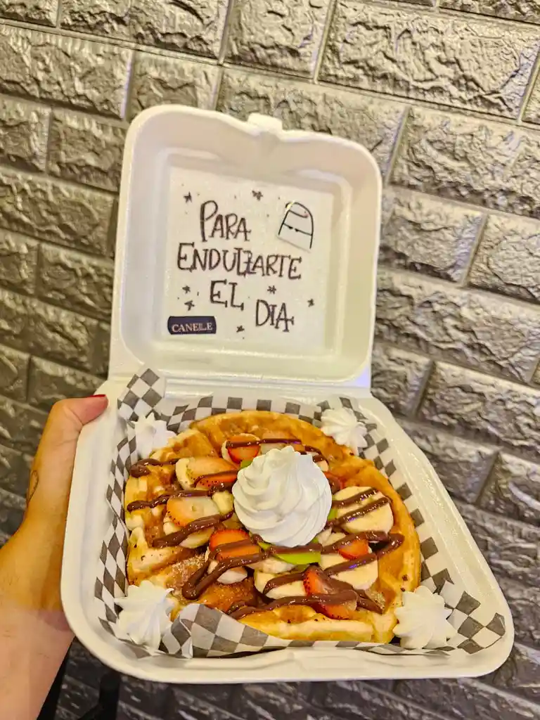 delicioso wafle fresco con frutas salsa de chocolate y chantilly, con un mensaje personalizado en la tapa
