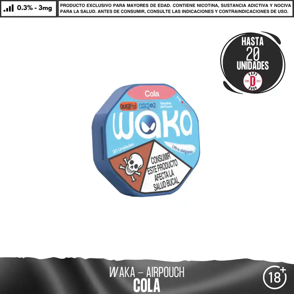 WAKA AirPouch La WAKA AirPouch es una innovadora bolsita de nicotina ultradelgada diseñada para ofrecer una experiencia potente, discreta y sin humo. Con un espesor de menos de 1 mm, es más delgada que muchas bolsas tradicionales, brindando una sensación cómoda al usarla. Características principales: Concentración de nicotina: 3 mg o 6 mg, adaptándose a distintas necesidades. Sabores disponibles: Cola, Menta, Sandía (3 mg y 6 mg) y una opción cítrica. Presentación: Cada caja contiene 20 unidades. Uso: Se coloca entre la encía y el labio superior, actuando durante aproximadamente 30 a 60 minutos. Tecnología: Liberación controlada de nicotina para una experiencia gradual y sostenida. Ventajas: Discreción: No genera vapor ni humo, ideal para usar en cualquier lugar. Portabilidad: Diseño compacto y delgado, fácil de llevar en el bolsillo o bolso. Duración prolongada: Entrega constante de nicotina hasta por una hora, según el sabor y concentración. Alternativa sin tabaco: Permite consumir nicotina sin fumar cigarrillos tradicionales. Instrucciones y advertencias: Abrir la caja y colocar suavemente la bolsita entre la encía y el labio superior. No masticar ni tragar la bolsita; desechar después de su uso. Conservar en un lugar fresco, seco y protegido de la luz solar directa. No recomendado para menores de edad, mujeres embarazadas ni personas con ciertas condiciones médicas. Vida útil: 24 meses desde la fecha de fabricación. Advertencia: Contiene nicotina, que puede ser venenoso. Evitar el contacto con la piel y los ojos. No ingerir. Mantener siempre en empaque original y en un ambiente fresco y seco. Mantener alejado de niños y mascotas. No debe utilizarse por Mujeres en estado de embarazo o personas con problemas de respiración como el asma. En caso de accidente contacte a la línea 123. Producto para mayores de 18 años.