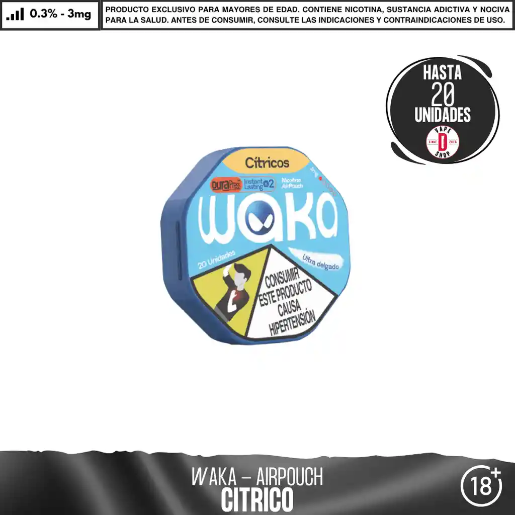 WAKA AirPouch La WAKA AirPouch es una innovadora bolsita de nicotina ultradelgada diseñada para ofrecer una experiencia potente, discreta y sin humo. Con un espesor de menos de 1 mm, es más delgada que muchas bolsas tradicionales, brindando una sensación cómoda al usarla. Características principales: Concentración de nicotina: 3 mg o 6 mg, adaptándose a distintas necesidades. Sabores disponibles: Cola, Menta, Sandía (3 mg y 6 mg) y una opción cítrica. Presentación: Cada caja contiene 20 unidades. Uso: Se coloca entre la encía y el labio superior, actuando durante aproximadamente 30 a 60 minutos. Tecnología: Liberación controlada de nicotina para una experiencia gradual y sostenida. Ventajas: Discreción: No genera vapor ni humo, ideal para usar en cualquier lugar. Portabilidad: Diseño compacto y delgado, fácil de llevar en el bolsillo o bolso. Duración prolongada: Entrega constante de nicotina hasta por una hora, según el sabor y concentración. Alternativa sin tabaco: Permite consumir nicotina sin fumar cigarrillos tradicionales. Instrucciones y advertencias: Abrir la caja y colocar suavemente la bolsita entre la encía y el labio superior. No masticar ni tragar la bolsita; desechar después de su uso. Conservar en un lugar fresco, seco y protegido de la luz solar directa. No recomendado para menores de edad, mujeres embarazadas ni personas con ciertas condiciones médicas. Vida útil: 24 meses desde la fecha de fabricación. Advertencia: Contiene nicotina, que puede ser venenoso. Evitar el contacto con la piel y los ojos. No ingerir. Mantener siempre en empaque original y en un ambiente fresco y seco. Mantener alejado de niños y mascotas. No debe utilizarse por Mujeres en estado de embarazo o personas con problemas de respiración como el asma. En caso de accidente contacte a la línea 123. Producto para mayores de 18 años.