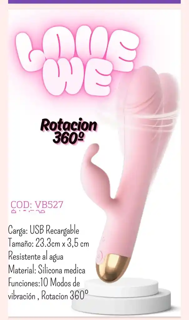 Vibrador con carga USB, tamaño 23.3 cm por 3.5 cm, resistente al agua, material en silicona médica, funciones 10 modos de vibración, rotación 360 grados.