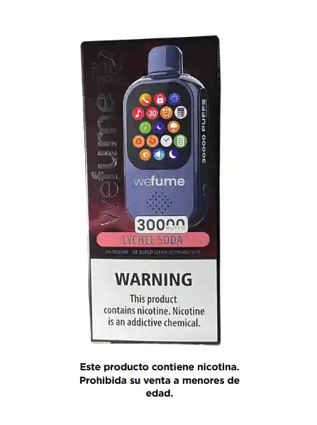 VAPEADOR WE FUME VAPEAD 30.000 VAPEADAS SABOR LYCHEE SODA . RECARGABLE, ´PANTALLA TACTIL INDICADOR DE BATERIA, COMPATIBLE CON DISPOSITIVOS MOVILES PARA EL USO DE APLICACIONES ESTE PRODCUTO CONTIENE NICOTINA UNA SUSTANCIA ADICTIVA, ES PERJUDICIAL PARA LA SALUD, PROHIBIDA SU VENTA A MENORES DE EDAD.