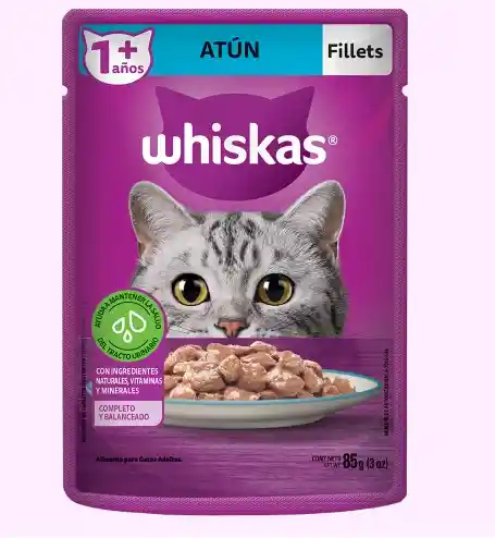 Los sobres Whiskas son trocitos cocidos al vapor, que le otorgan el balance ideal de fibras naturales, minerales, vitaminas a y Taurina que tu gatito necesita a para un optimo desarrollo, es el comienzo ideal de una vida saludable. La exclusiva y revolucionaria recetas de Whiskas le ofrece a tu mascota suaves y deliciosos filetitos , que difrutará tu gato en cada comida. Alimento 100% completo y balanceado para gatos. Recuera que todos los alimentos Whiskas son respaldados por el Centro de Investigación Waltham, líder en cuidado y nutrición de l as mascotas. En cada sobre encontrarás ricos trocitos que esta adicionada con fibras naturales, minerales, vitamina a y Taurina en un balance ideal para tu gatito; son una rica fuente de hidratación que ayuda a prevenir la formación de cálculos renales, Ideales para el consumo diario. Puedes dárselos solos o acompañados; ya que son un alimento 100% completo y balanceado pensado para gatos.