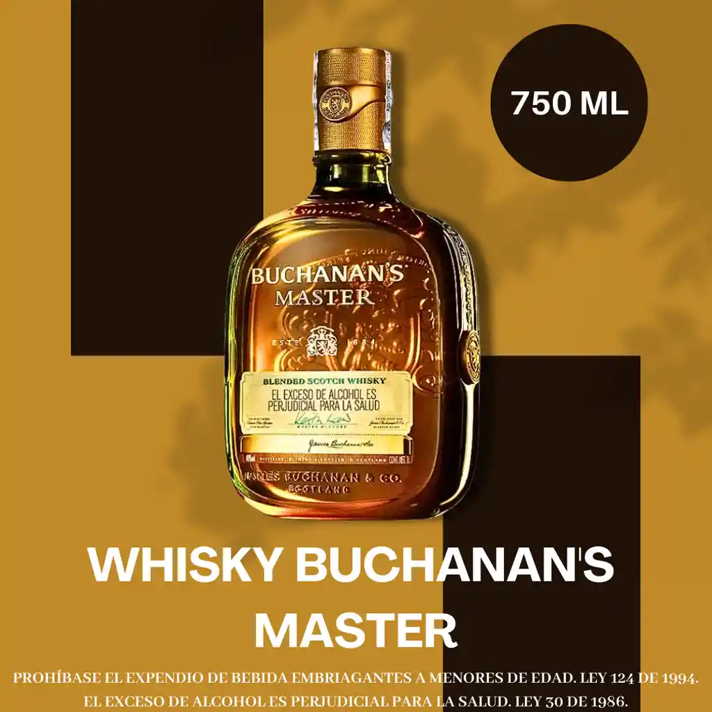 Whisky Buchanans Master, con notas al paladar de crema de miel, sedoso cuerpo blando, ligeramente ahumado, nuez tostada y con un acabado ligeramente de especias picantes. Una mezcla de satisfacción única.