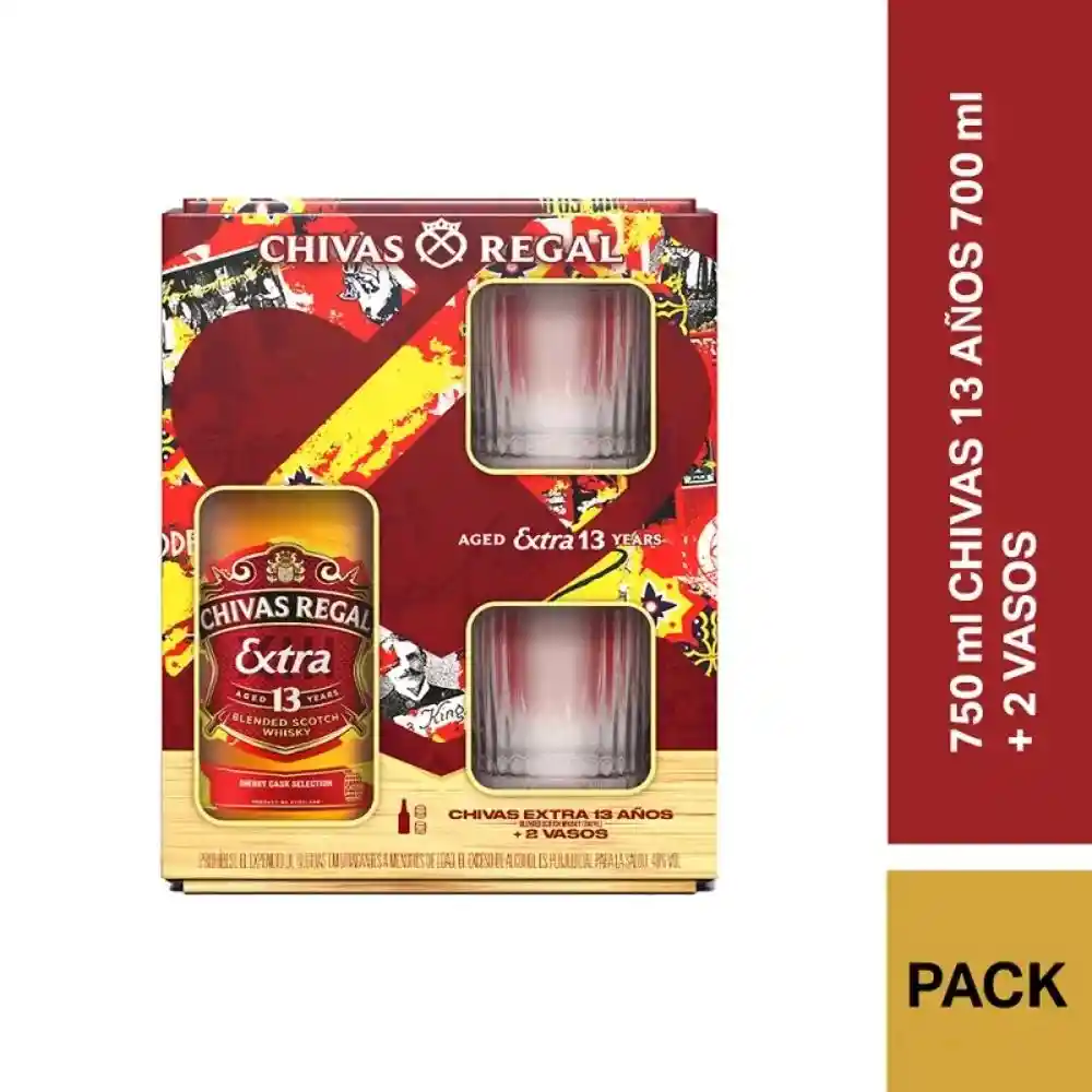 Contenido: Whisky CHIVAS REGAL extra 13 años + 2 vasos (700 ml) Prohibase el expendio de bebidas embriagantes a menores de edad. Él exceso de alcohol es perjudicial para la salud.