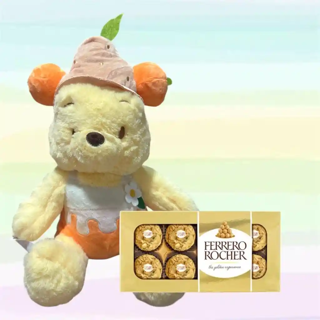 Lleva a casa un Winnie Pooh con sombrerito 🐻🎩 acompañado de 8 Ferrero Rocher 🍫. Un regalo que une dulzura y sabor para alegrar el día de alguien especial.