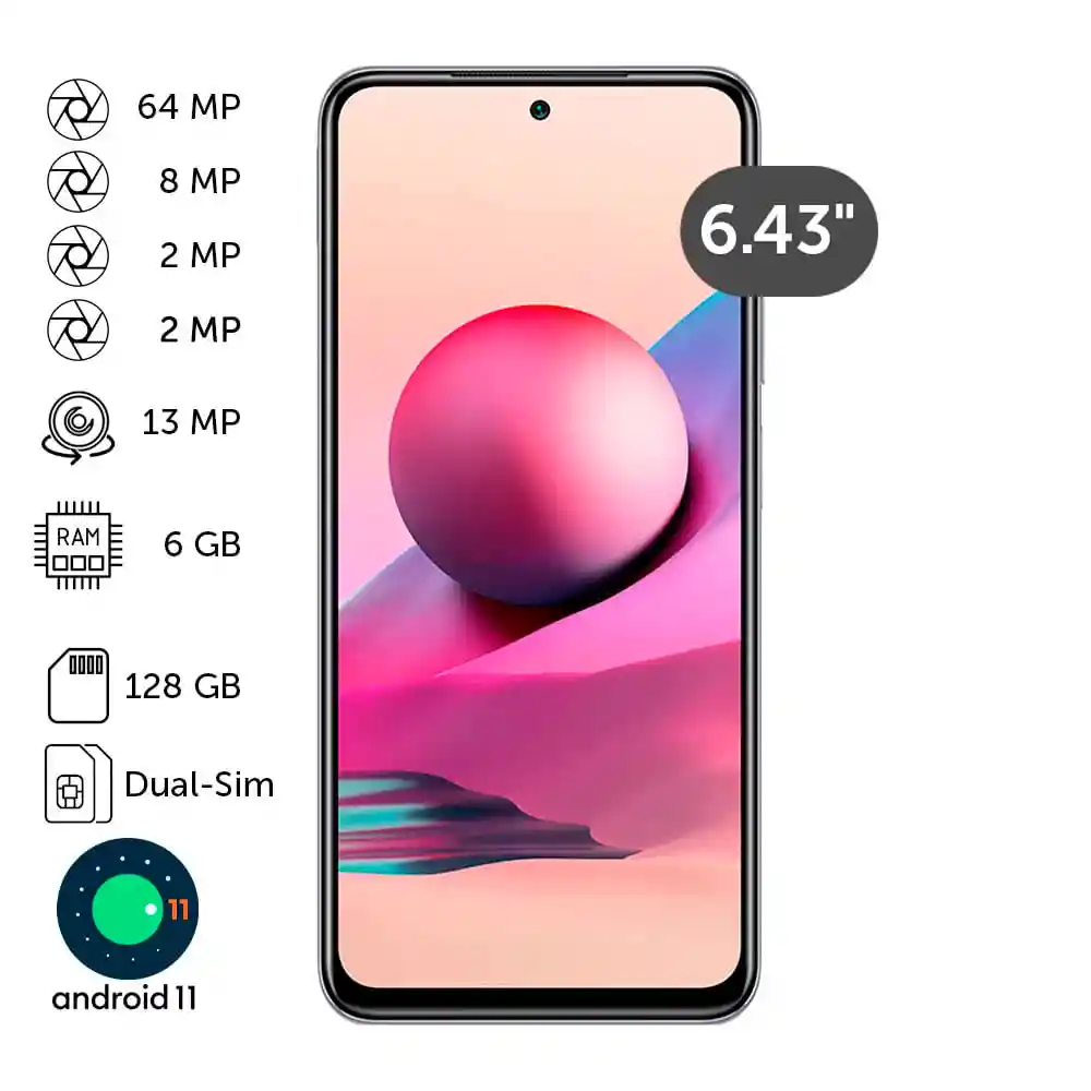 El Xiaomi Redmi Note 10S es una versión del Redmi Note 10 que mejora la cámara de fotos trasera. Conservando la pantalla Super AMOLED de 6.43 pulgadas a resolución Full HD+, el Redmi Note 10S está potenciado por un procesador Helio G95 de Mediatek, con 8GB de memoria RAM y 128GB de almacenamiento interno expandible. La cámara posterior tiene una configuración cuádruple, con lentes de 64MP, 8MP, 2MP y 2MP, mientras que la cámara frontal es de 13MP. El Redmi Note 10S cuenta con una batería de 5000 mAh de carga rápida, parlantes stereo, lector de huellas montado de lado, y corre MIUI 12 basado en Android 11.