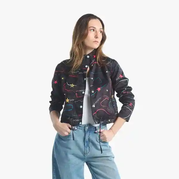 Chaqueta Circuitos - Negro: Esta chaqueta de manga larga, en elegante tono negro, presenta bolsillos de ribete y una cintura ajustable para un ajuste personalizado. Su diseño cuenta con un cierre de cremallera y botones de presión. Destaca por el exclusivo estampado "Circuitos", resultado de nuestra colaboración con la piloto Tata Calderón. Composición: Fabricada con materiales de alta calidad, el exterior es 100% poliéster, al igual que el forro, garantizando resistencia y confort. Ocasiones de uso: Ideal para quienes buscan un estilo moderno y audaz, perfecto tanto para eventos casuales como para entornos más formales, combinando fácilmente con diversas prendas de tu guardarropa. Cuidados especiales: Se recomienda consultar y seguir las instrucciones de la etiqueta de cuidados antes del lavado.