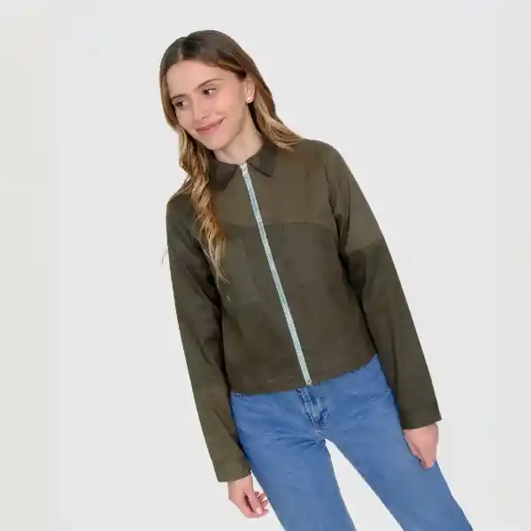 Chaqueta de drill con cuello camisero y manga larga con cortes que forman montañas de color verde claro y verde oscuro Composición: 98% Algodón, 2% spandex. La modelo mide 1.67 mts y está usando talla XS Cuidados especiales de la prenda: No usar blanqueador No usar secadora Puede encoger en la primera lavada Leer la etiqueta de cuidados