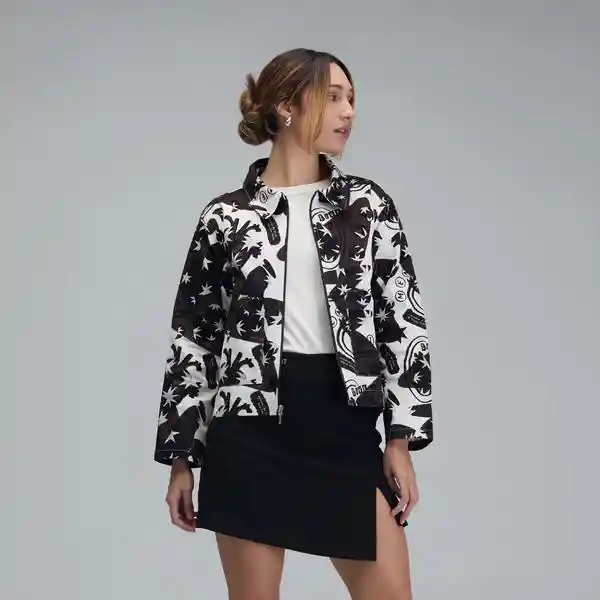Chaqueta café estampada de cuello sport y manga larga. Presenta dos bolsillos delanteros tipo parche en “L” y sistema de cierre central con cremallera plástica. Composición: 100% algodón. La modelo mide 1,69 m y usa talla XS. Cuidados especiales: Leer la etiqueta de cuidados antes de lavar.