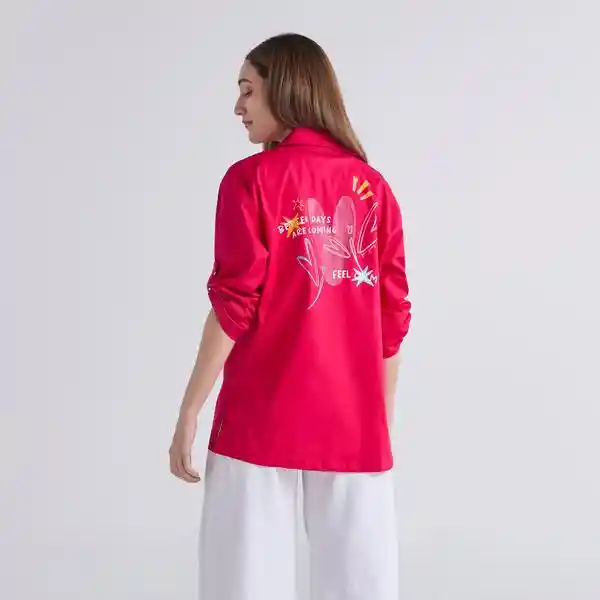 Camisa Feel - Fucsia: Camisa fucsia de cuello clásico y hombros caídos, manga 3/4 con charreteras, bolsillos tipo parche en el delantero y cierre frontal con botones. Cuenta con arte en los bolsillos delanteros y en la parte posterior. Composición: 97% algodón, 3% elastómero. Cuidados: Leer la etiqueta de cuidados antes de lavar.