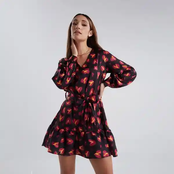 Vestido Heart - Negro: Diseño: Este encantador vestido corto presenta un escote en V y un elegante bolero en la parte inferior. Las mangas abullonadas se completan con puños abotonados, y además incluye dos pasadores en los costados junto con un cinturón removible. Posee un estilizado estampado “heart print”. Composición: Confeccionado con un 95% de poliéster y 5% de spandex, ofreciendo una mezcla de comodidad y elasticidad. Ocasiones de uso: Ideal para ocasiones especiales o eventos casuales, este vestido combina elegancia y estilo, siendo una elección perfecta para una variedad de entornos. Cuidados especiales: Se recomienda leer la etiqueta de cuidados antes de proceder al lavado para mantener su calidad y apariencia.
