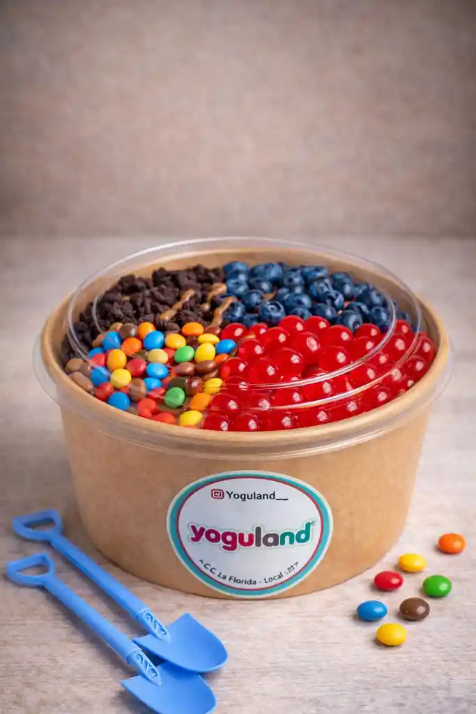 Nuestra opción ideal para compartir: helado a base de yogurt con dos sabores a elección, acompañado de cuatro toppings seleccionados por ti, pensado para disfrutar sin límites y saborear cada cucharada. 750 ml.