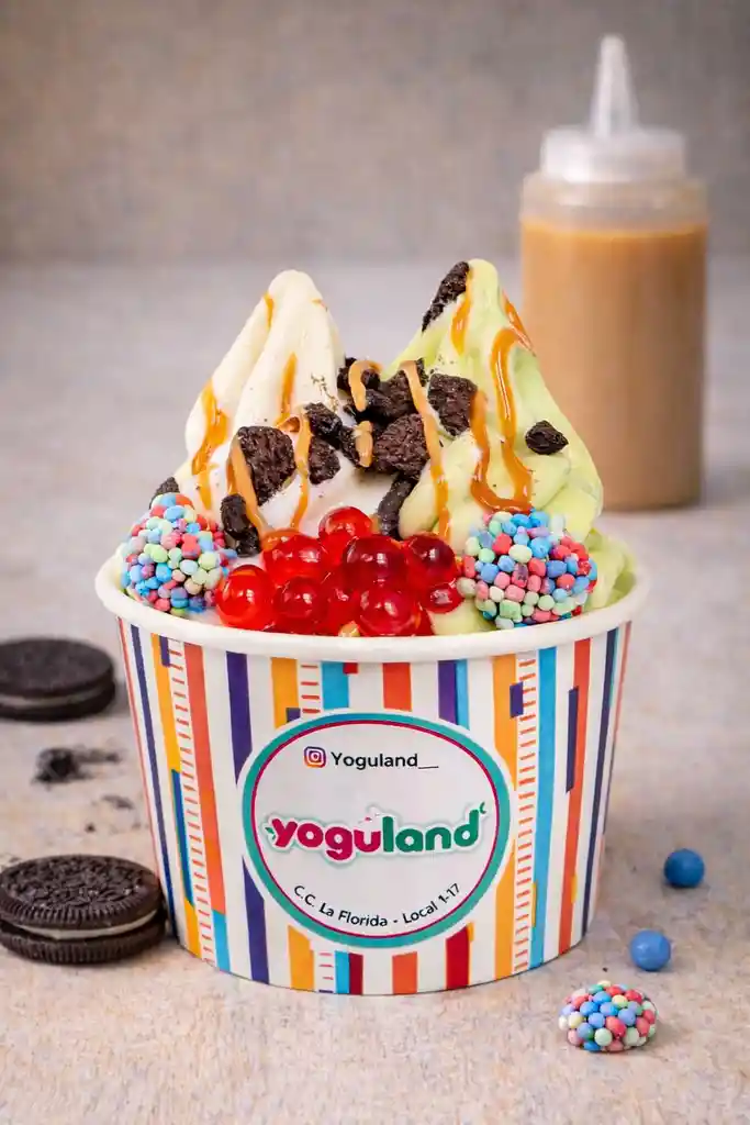 Una experiencia más completa: helado de yogurt con dos sabores combinables y tres toppings a elección, ideal para quienes buscan más cantidad y más disfrute en cada bocado. 260 g.