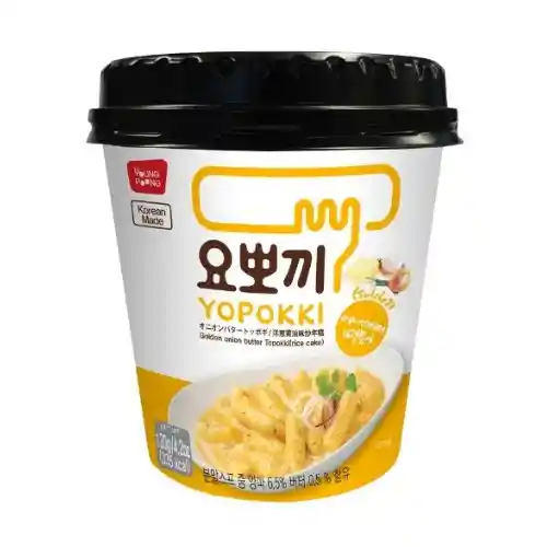 Tteokbokki coreano listo para preparar, elaborado con suaves pasteles de arroz en una cremosa y deliciosa salsa de mantequilla con cebolla dorada. De sabor suave, reconfortante y ligeramente dulce, ideal para disfrutar una comida rápida con auténtico toque coreano en pocos minutos.