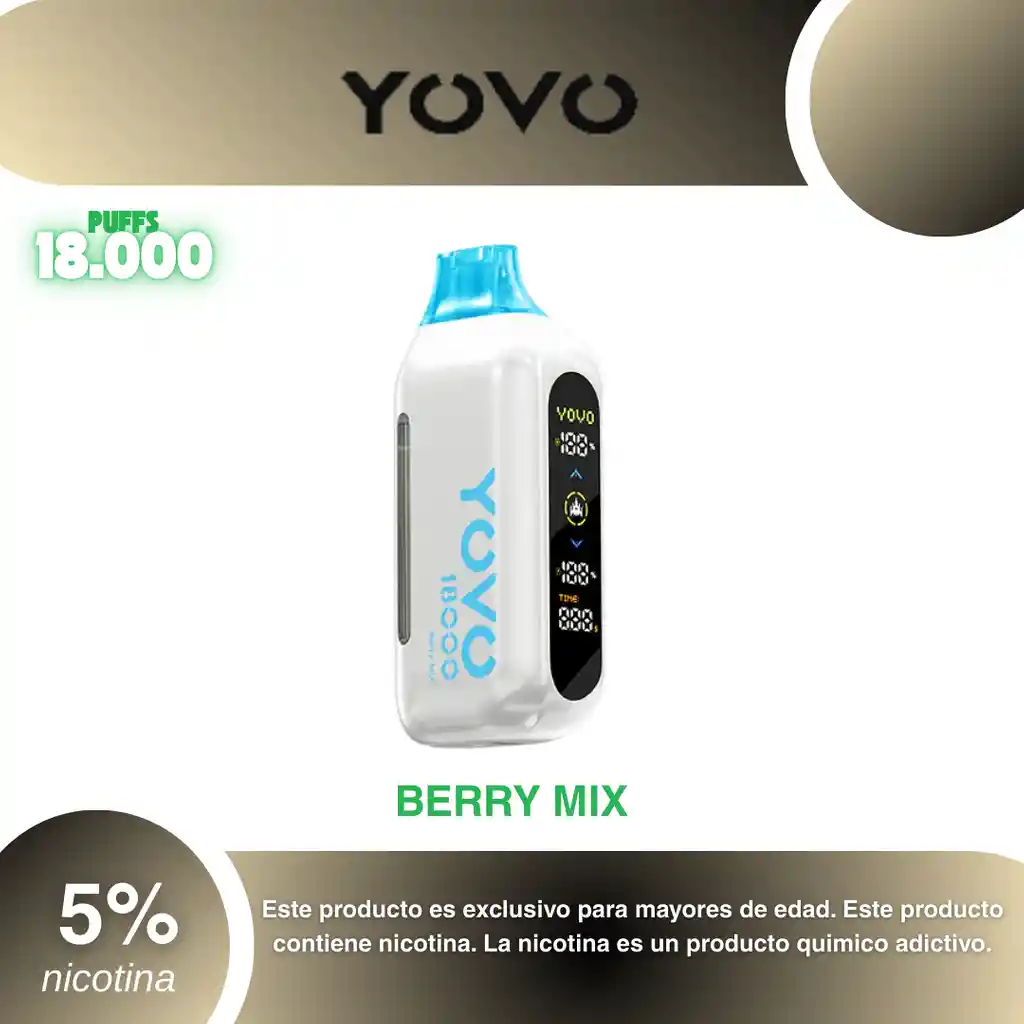 Yovo Ultra 18.000 Puffs, Sabor Frutos Rojos 5% PROHIBIDA LA VENTA A MENORES DE EDAD. ADVERTENCIA: ESTE PRODUCTO CONTIENE NICOTINA, LA NICOTINA ES UNA SUSTANCIA QUIMICA ADICTIVA Y NOCIVA PARA LA SALUD. Los líquidos para vapeo contienen: propilenglicol USP, glicerina USP, sabor artificial y nicotina. Este producto puede contener nicotina, una sustancia altamente adictiva que puede generar dependencia, posibles afectaciones arteriales, cardiacas, pulmonares y otras aun no identificadas. No se recomienda su uso a mujeres en embarazo, puede generar lesiones al feto. Mantener alejado de niños y mascotas. No ingerir, puede generar irritación y/o intoxicación. Por favor antes de consumir consulte a su médico posibles afectaciones o sensibilidad a alguno de sus componentes. Los componentes de este producto pueden aumentar la sensación de ansiedad En caso de notar alguna reacción adversa por favor suspenda su uso de manera inmediata. Siga las instrucciones en el envase. No alterar sus componentes. Adquiera sus productos en sitios de confianza No use productos piratas, alterados, o en los cuales no pueda comprobar su buena procedencia, Verifique la reputación del fabricante y distribuidor antes de adquirir cualquier producto Si no es usuario fumador o vapeador no se recomienda su uso bajo ninguna circunstancia Al usar este producto usted es consciente que este producto puede generar afectaciones a su salud, incluyendo aquellas que a la fecha de la compra no se han identificado y que pueden aparecer a largo plazo