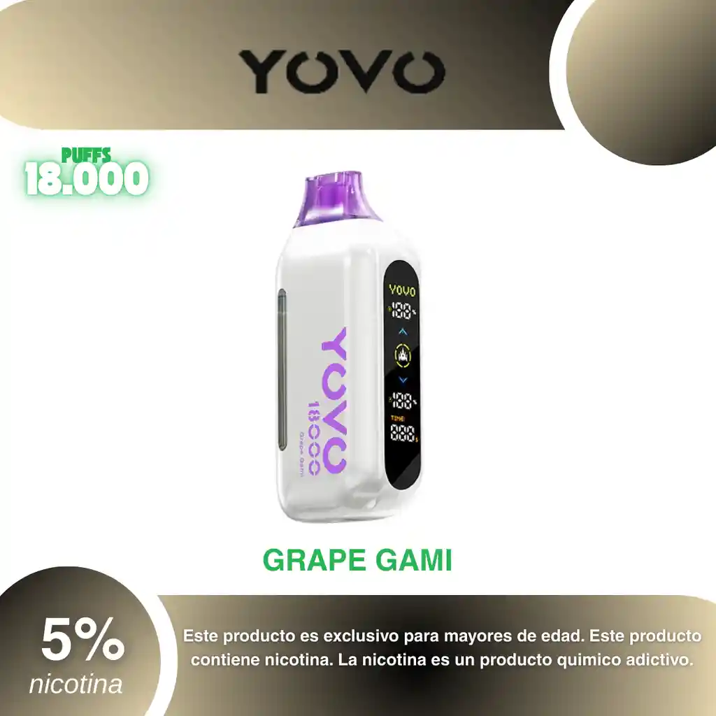 Yovo Ultra 18.000 Puffs, Sabor Uva 5% PROHIBIDA LA VENTA A MENORES DE EDAD. ADVERTENCIA: ESTE PRODUCTO CONTIENE NICOTINA, LA NICOTINA ES UNA SUSTANCIA QUIMICA ADICTIVA Y NOCIVA PARA LA SALUD. Los líquidos para vapeo contienen: propilenglicol USP, glicerina USP, sabor artificial y nicotina. Este producto puede contener nicotina, una sustancia altamente adictiva que puede generar dependencia, posibles afectaciones arteriales, cardiacas, pulmonares y otras aun no identificadas. No se recomienda su uso a mujeres en embarazo, puede generar lesiones al feto. Mantener alejado de niños y mascotas. No ingerir, puede generar irritación y/o intoxicación. Por favor antes de consumir consulte a su médico posibles afectaciones o sensibilidad a alguno de sus componentes. Los componentes de este producto pueden aumentar la sensación de ansiedad En caso de notar alguna reacción adversa por favor suspenda su uso de manera inmediata. Siga las instrucciones en el envase. No alterar sus componentes. Adquiera sus productos en sitios de confianza No use productos piratas, alterados, o en los cuales no pueda comprobar su buena procedencia, Verifique la reputación del fabricante y distribuidor antes de adquirir cualquier producto Si no es usuario fumador o vapeador no se recomienda su uso bajo ninguna circunstancia Al usar este producto usted es consciente que este producto puede generar afectaciones a su salud, incluyendo aquellas que a la fecha de la compra no se han identificado y que pueden aparecer a largo plazo