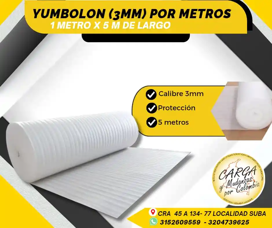 En el mercado se pueden encontrar como Yumbolon (Jumbolon) o Superlon, es una espuma de polietileno conformado por miles de micro-almohadillas llenas de aire, material que protege sus productos durante la manipulación, transporte y almacenaje ya que es un producto que amortigua impactos. Producto utilizado también como aislante térmico. Impermeable y antiestático. Este material de embalaje simultáneamente proporciona protección de: Golpes y rayones. Humedad y manchas. Medidas: 1M DE ALTO X 5 METROS DE LARGO calibre: 3mm Alta Calidad - Producto Garantizado. Visítanos: Cr. 45a # 134 - 77 Local Esquina Contáctanos: 315 2609 559 *ASESORIA SIN COSTO POR WHATSAAP*