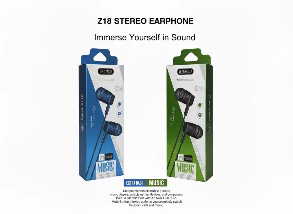 🎧 Audífonos Stereo Z18 – Potencia y Estilo en Cada Nota Sumérgete en una experiencia de sonido envolvente con los Z18 Stereo Earphone, diseñados para ofrecerte bajos profundos, audio nítido y comodidad durante todo el día. Ideales para escuchar música, jugar o atender llamadas con su micrófono integrado y botón multifunción. Su diseño moderno, disponible en colores azul y verde, combina rendimiento, durabilidad y estilo en un solo accesorio. ✨ Características destacadas: • Sonido Extra Bass con calidad estéreo. • Compatible con teléfonos, computadores y consolas portátiles. • Control de llamadas y música desde el cable. • Conector Jack 3.5 mm universal.