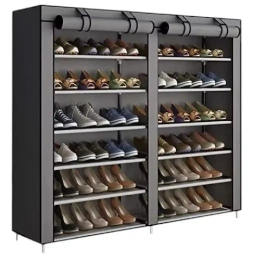Fabricado en tela. Entran hasta 36 pares de zapatos. Tiene 2 estantes. Tiene 12 cajones. Dimensiones: 115cm de ancho, 120cm de alto y 30cm de profundidad.