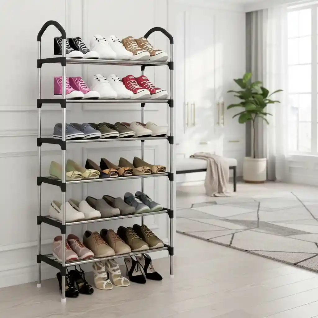 Fabricado en acero inoxidable. Entran hasta 18 pares de zapatos. Tiene 6 estantes. Dimensiones: 58cm de ancho, 116cm de alto y 30cm de profundidad.