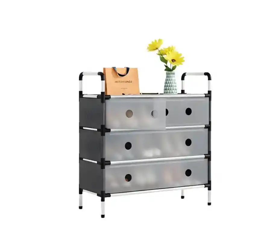 Este es un organizador de zapatos de 3 niveles con cubierta antipolvo, comúnmente comercializado como zapatero organizador metálico. Diseño: Cuenta con tres compartimentos cerrados por una cubierta translúcida para proteger el calzado del polvo. Capacidad: Incluye espacio adicional en la parte inferior para pares de zapatos de uso diario. Dimensiones: La altura total de la estructura es de aproximadamente 74 cm, con 17 cm de alto por compartimento.